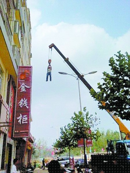 據(jù)悉,正在作業(yè)的是嵩縣大千廣告公司工作人員,他們正在為一家KTV修理戶外廣告牌。記者聯(lián)系上該廣告公司,工作人員稱由于廣告牌需要安裝螺絲,就找來吊車用安全繩將工人吊起進行高空作業(yè)。