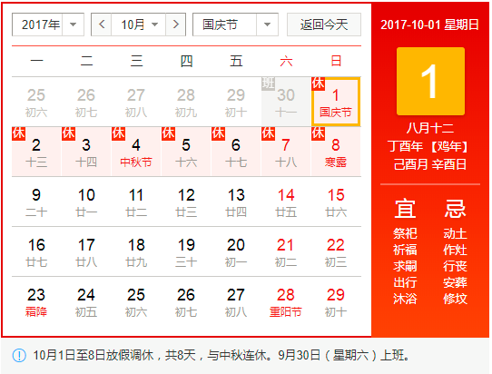 放假時(shí)間:10月1日至10月8日,共8天,10月9日(星期一)開始正常上班。請(qǐng)大家提前做好放假前后的準(zhǔn)備,請(qǐng)知曉!