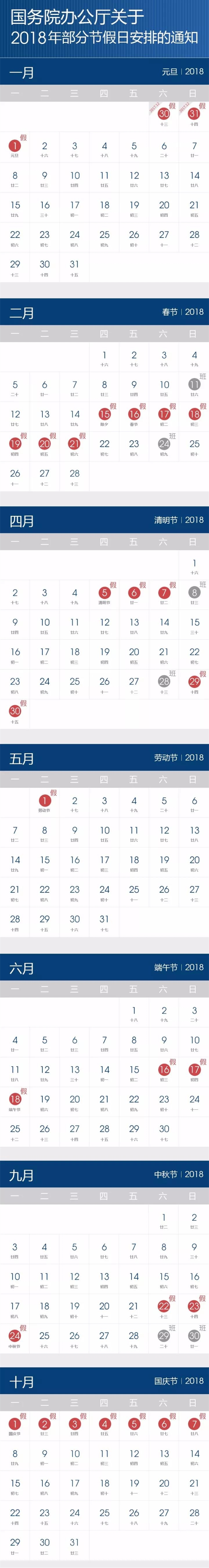 根據(jù)國(guó)家規(guī)定,現(xiàn)將2018年元旦、春節(jié)、清明節(jié)、勞動(dòng)節(jié)、端午節(jié)、中秋節(jié)和國(guó)慶節(jié)放假調(diào)休日期的具體安排通知如下。
