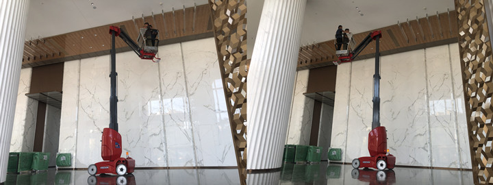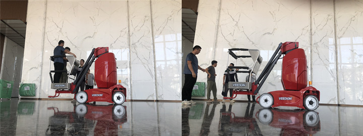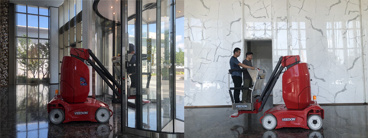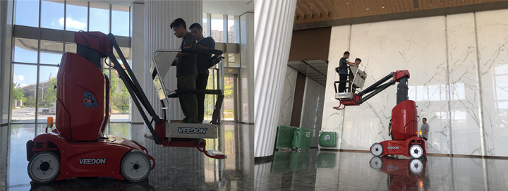 Veedon高空作業(yè)平臺用于寫字樓大廳日常維護檢修,外立面保潔清潔,設(shè)備安裝檢修